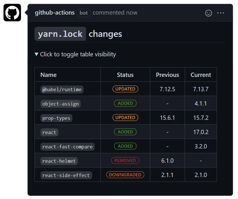 These actions will make a human-readable version of changes to your package-lock.json or yarn.lock file, which can otherwise be quite opaque. For Yarn, you can use this action. I would recommend a setup like this, where it only runs if your yarn.lock actually changes. Similarly, you can use this action to create a human-readable comment for your package-lock.json file, with a setup like this example to only run when the package-lock.json file has actually been changed.