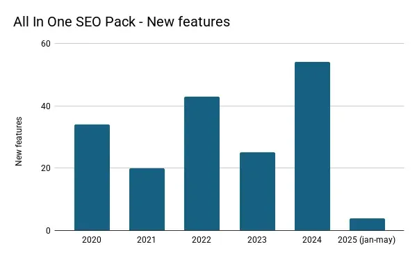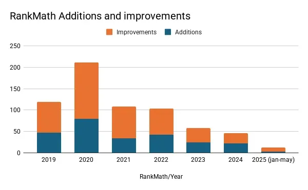 Since 2021, Yoast SEO has introduced fewer enhancements, with a notable decline in 2024, and early indications for 2025 suggest a continued downturn. Rank Math exhibits a similar trend, with a marked slowdown in innovation during 2024 and 2025. In contrast, AIOSEO experienced a surge in new features in 2024, but projections for 2025 (based on changelogs so far) also indicate a significant decline.