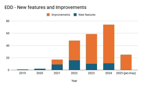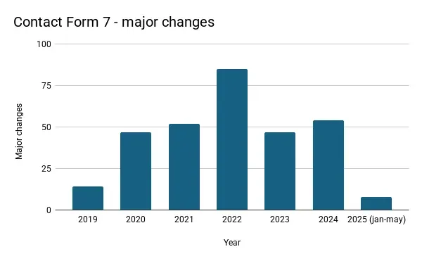 Marieke then further analyzed the innovation trends of five other notable plugins, revealing a mixed picture. WP Rocket and Elementor have demonstrated steady, consistent innovation, although 2025 shows a slight slowdown, possibly indicating an upcoming major release. Contact Form 7 has exhibited a gradual decline in innovation since 2022. Easy Digital Downloads (EDD) experienced a growth in new features during 2024, yet 2025 appears to lag behind. GiveWP, on the other hand, has maintained a relatively stable pace of innovation. While 2025 shows a dip, this pattern mirrors 2022, and innovation rebounded in 2023.
