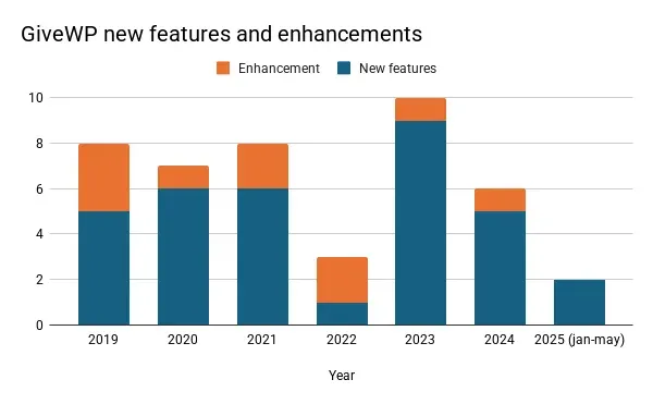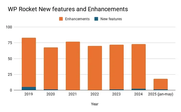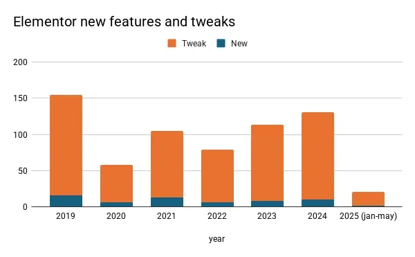 Looking at WooCommerce, we see they released many new features from 2021 onwards. However, this year they seem to be behind schedule. Perhaps they’re planning something significant, but it does look a bit concerning for 2025.